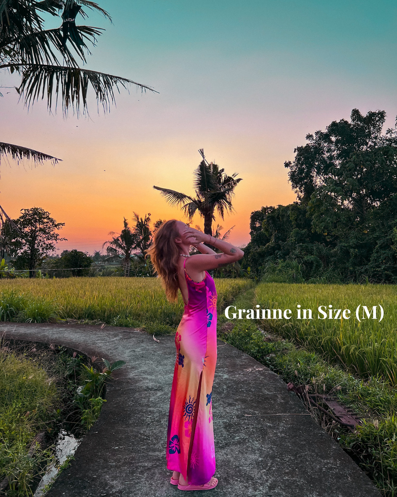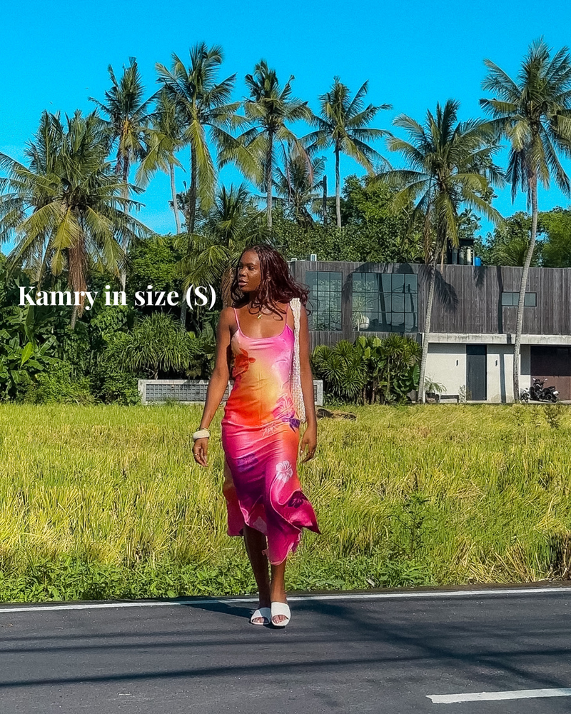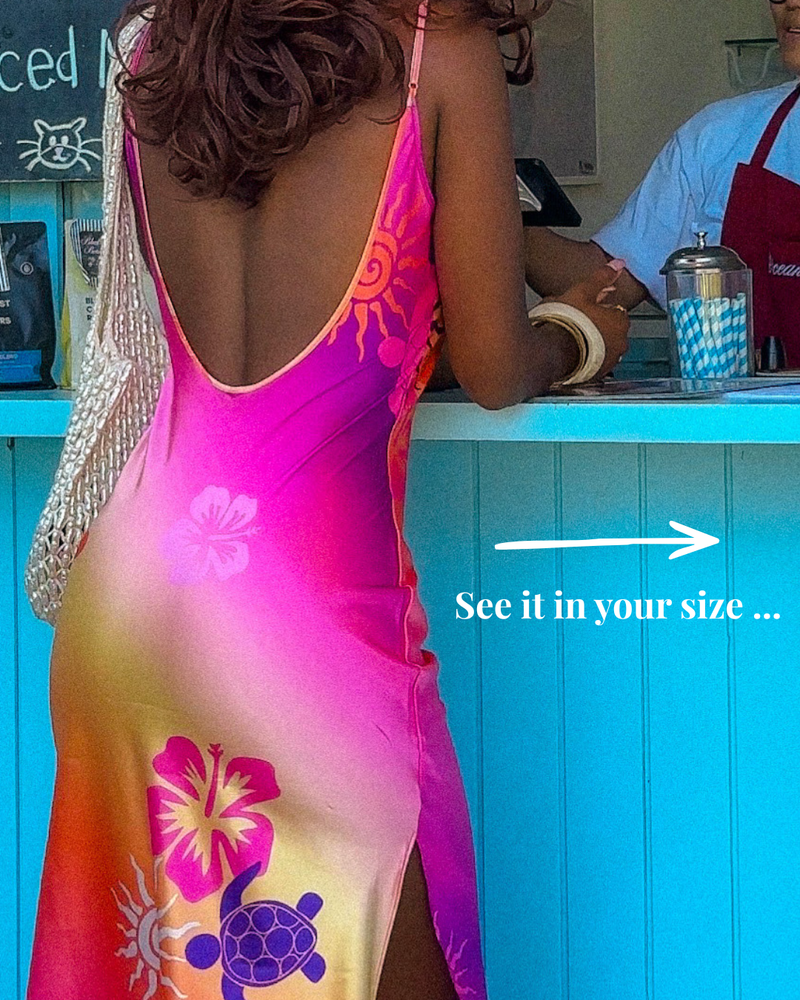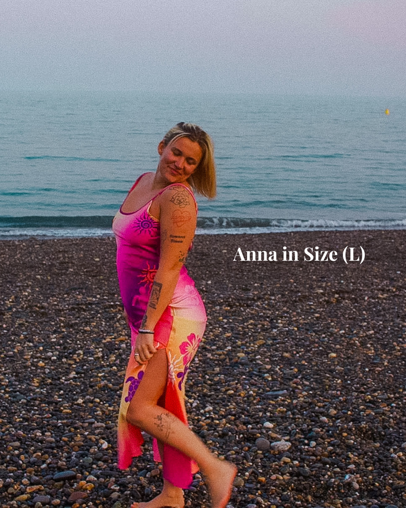 I am so in love with this dress I wear it every chance I get. Fits perfectly and flows so flattering. It goes so well with the other pieces too and I love pairing it with the reversible swimsuit. The colours are sooo beautiful and the quality is 10/10.