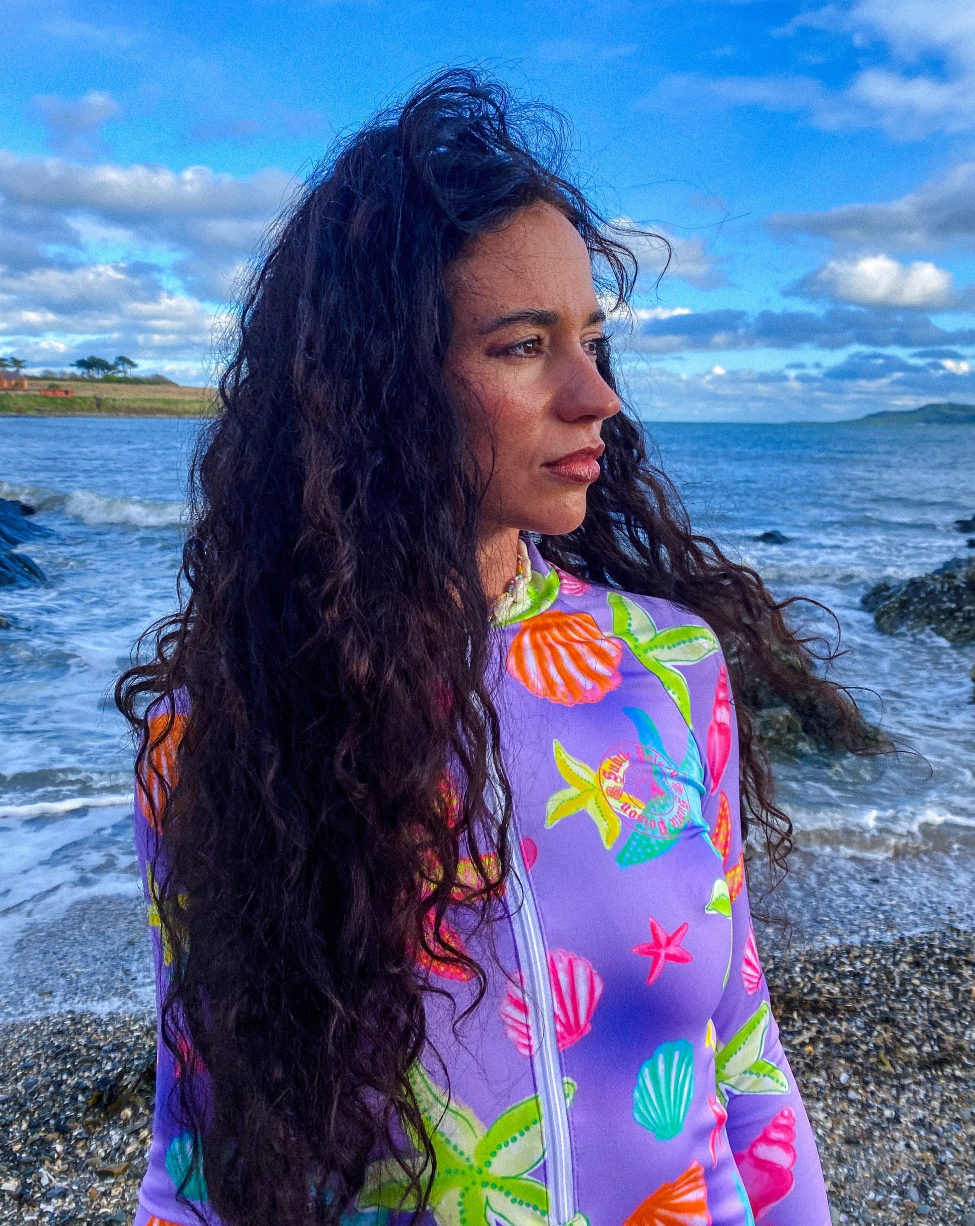 Mermaids and Beach Fairies, your search for the perfect swimsuit ends here! Set on a lilac background the vibrant seashell print is super fun! Whether you're embracing the chill of cold water or riding the waves in warmer seas, our Nautical swimsuit is your ideal companion, offering both warmth and sun protection. Dive into style with confidence!